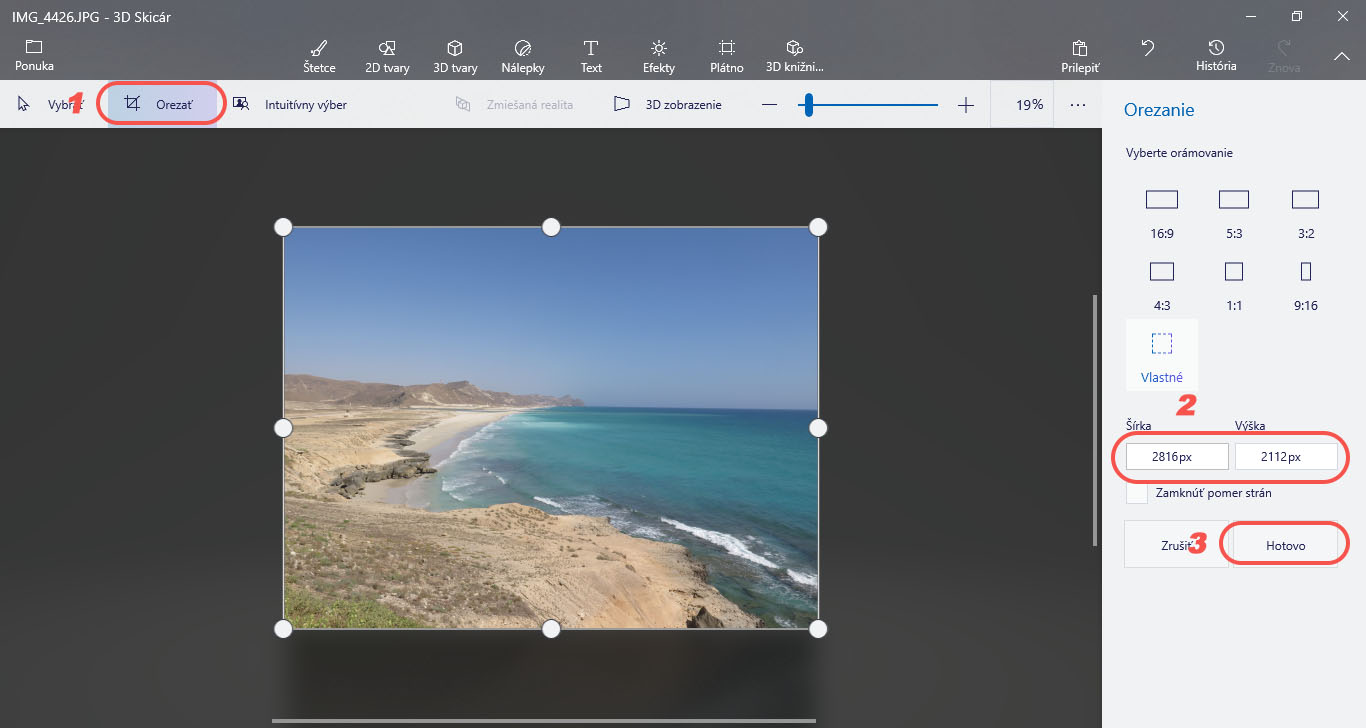 V 3D skicári otvoríte obrázok, kliknete na orezať (1), zvolíte požadovaný rozmer (2) a potvrdíte. Teraz postačuje obrázok už len uložiť.
